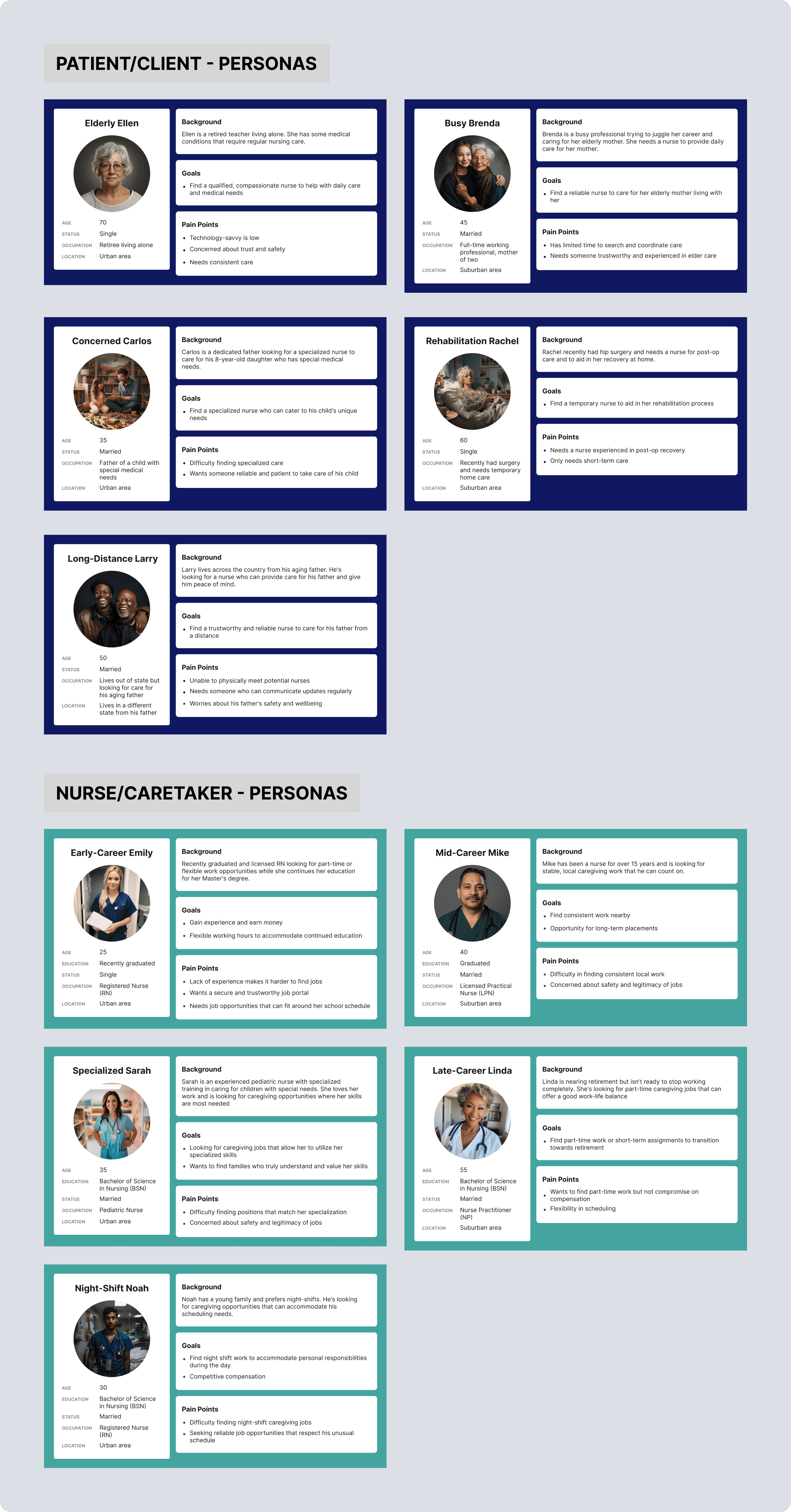 Developed distinct personas for both sides of the platform: clients seeking care, and caregivers/nurses offering services. Each profile captured goals, pain points, and trust drivers—laying the foundation for a balanced, user-centered experience.