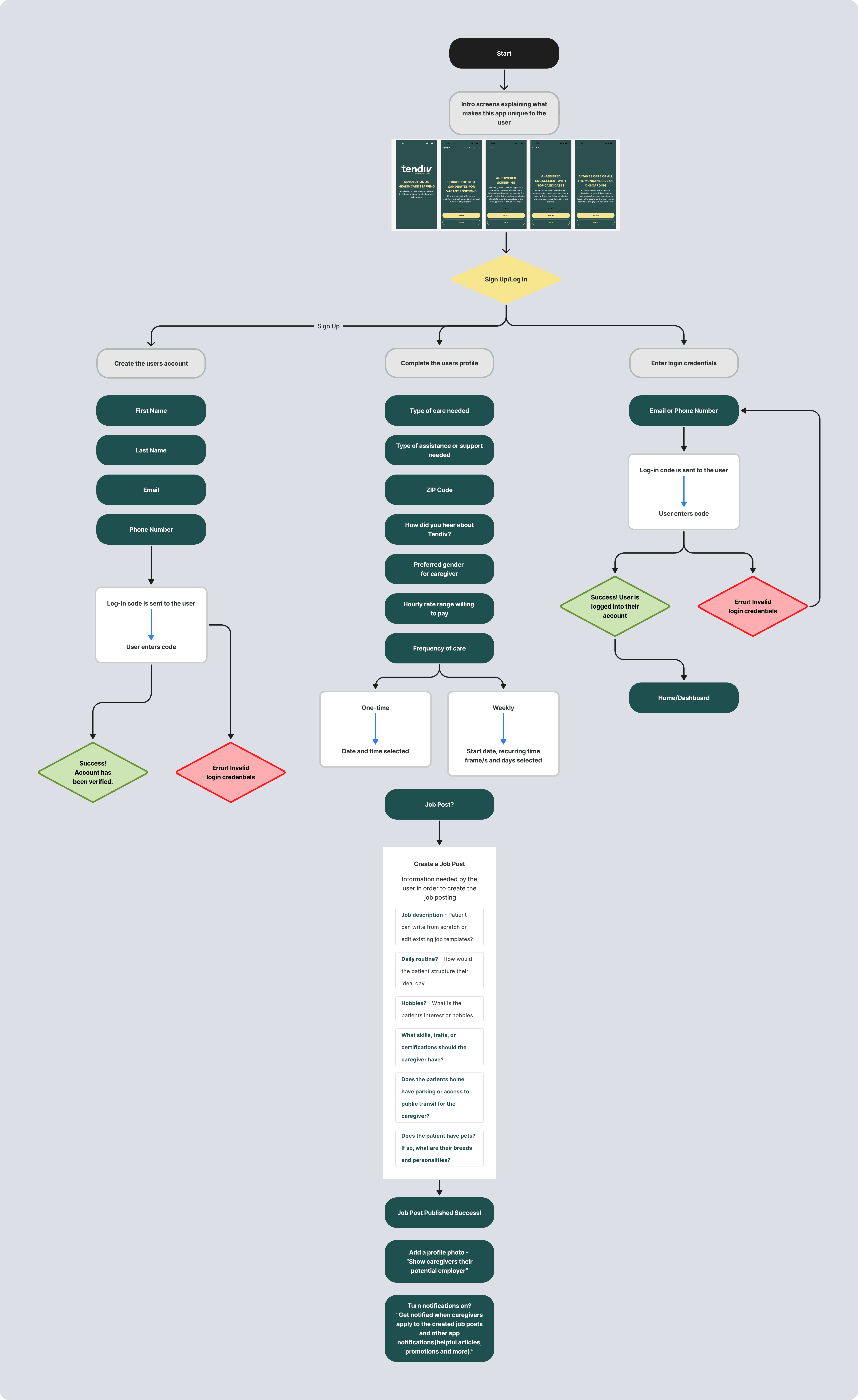 Mapped end-to-end user flows for both client and caregiver experiences. For clients, flows focused on requesting care, browsing profiles, and managing sessions. For caregivers and nurses, flows centered around onboarding, credentialing, availability setup, and job applications—designed to scale across roles with varying levels of complexity and compliance.